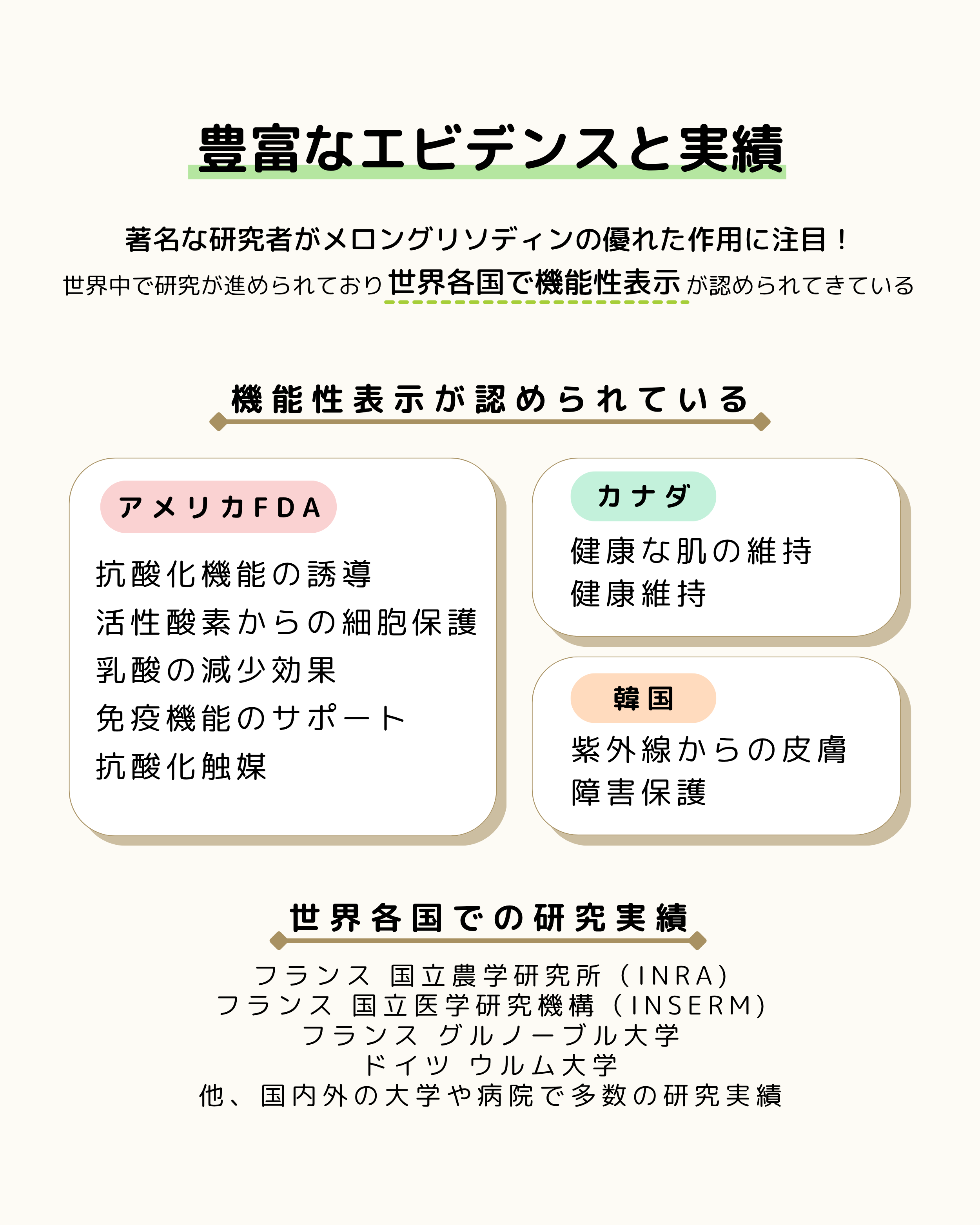 体内の抗酸化酵素を高める=人間の向上性を高める、という優れた作用に注目し、世界の著名な研究機関もエビデンスを多くとっています。