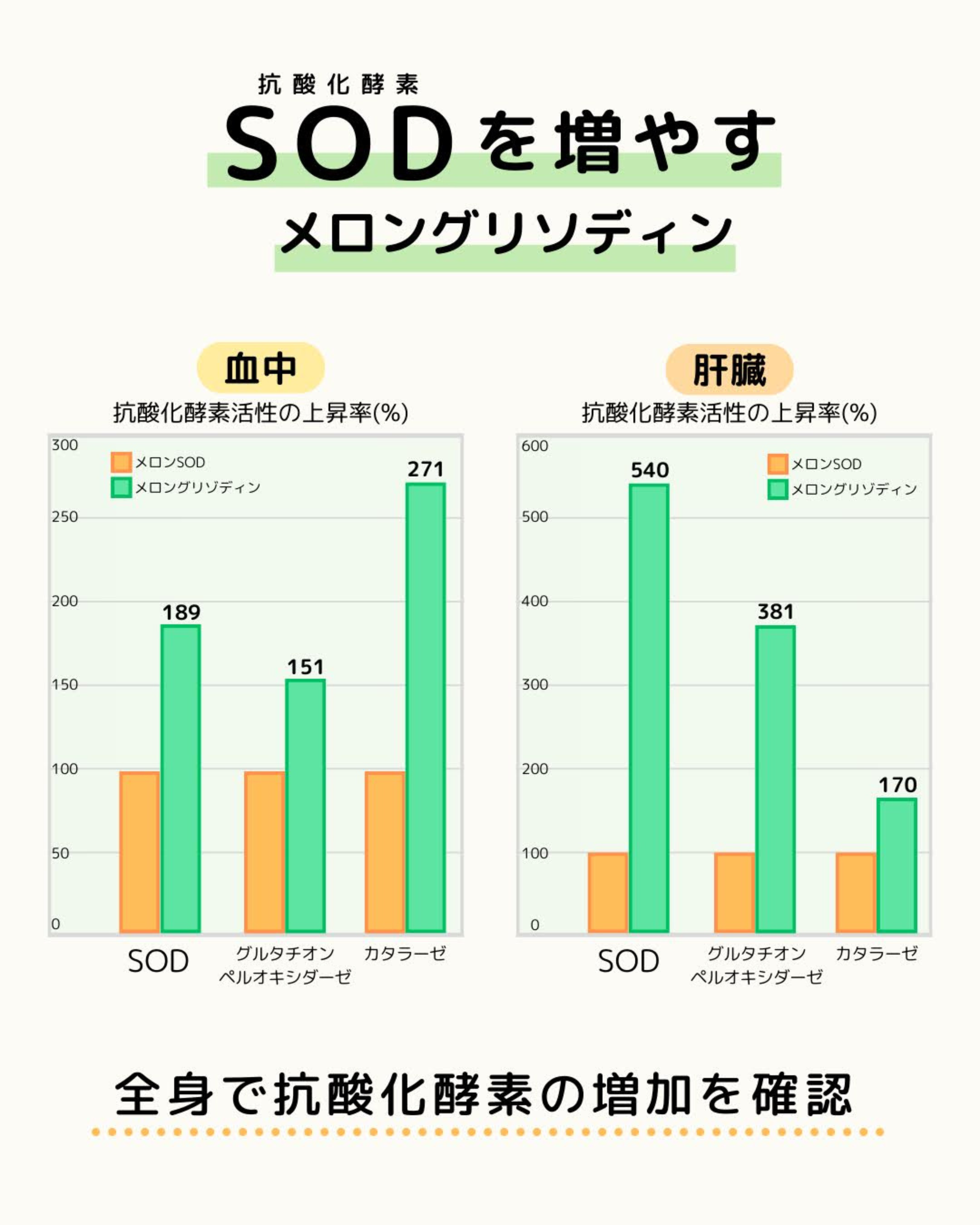 ヒトにとって重要な抗酸化酵素ですが、メロングリソディンを摂取すると体内の抗酸化酵素を増やす効果が確認されています!