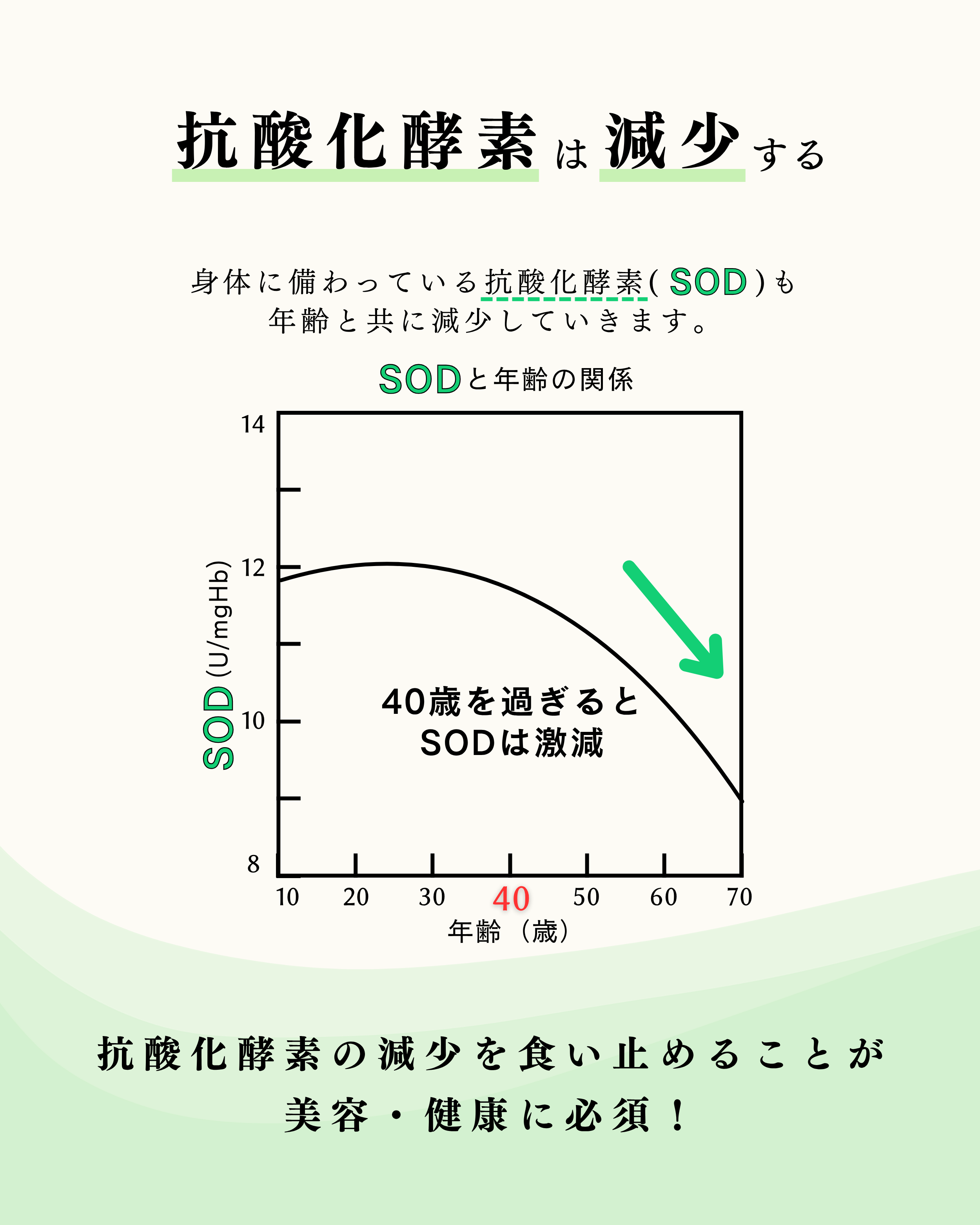 DNAを守るという重要な役割を果たしている抗酸化酵素ですが、年齢とともに減少し、40歳を過ぎると激減していくことが分かっています。