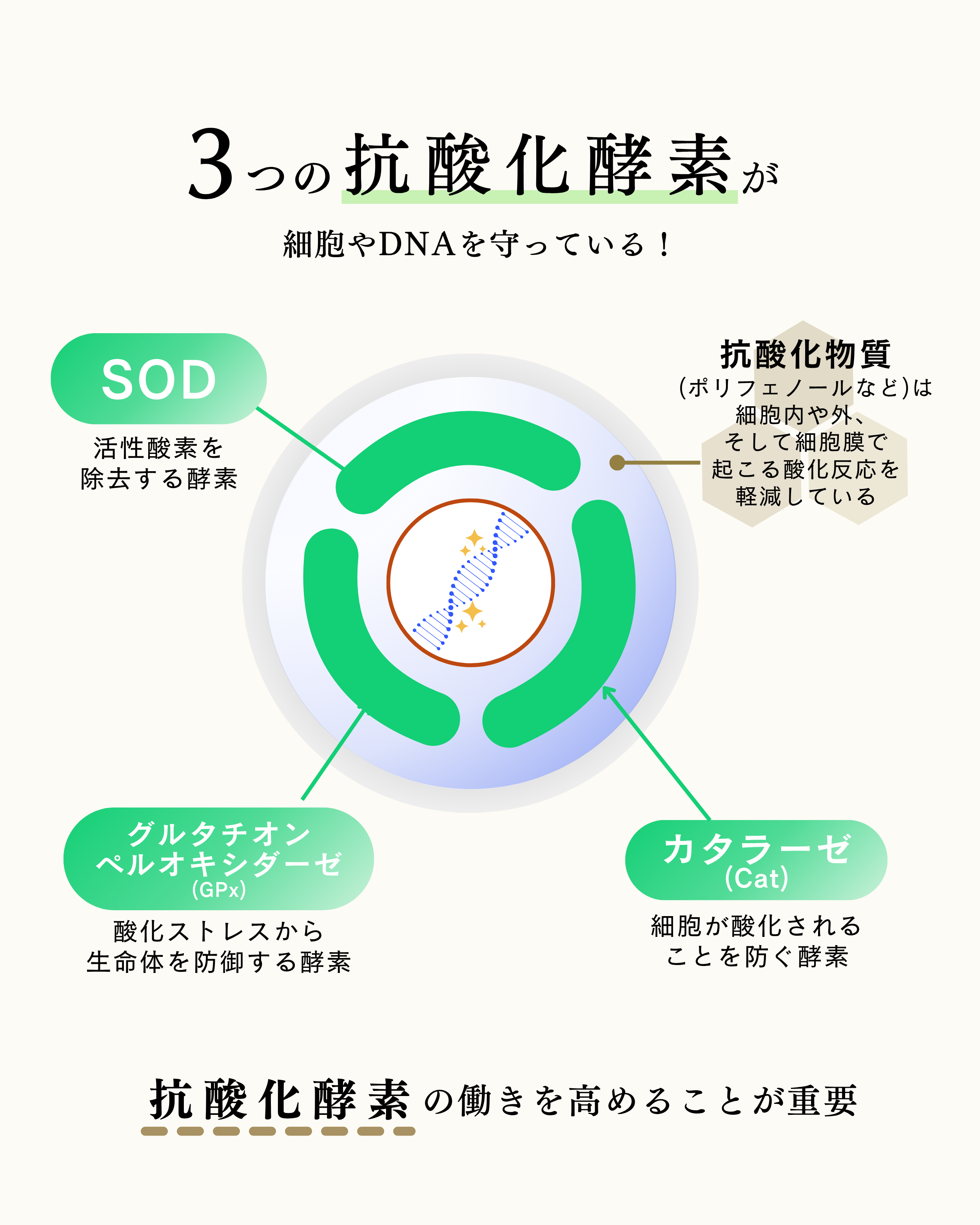 DNAを守るためには、抗酸化酵素・抗酸化物質の活動が重要です。