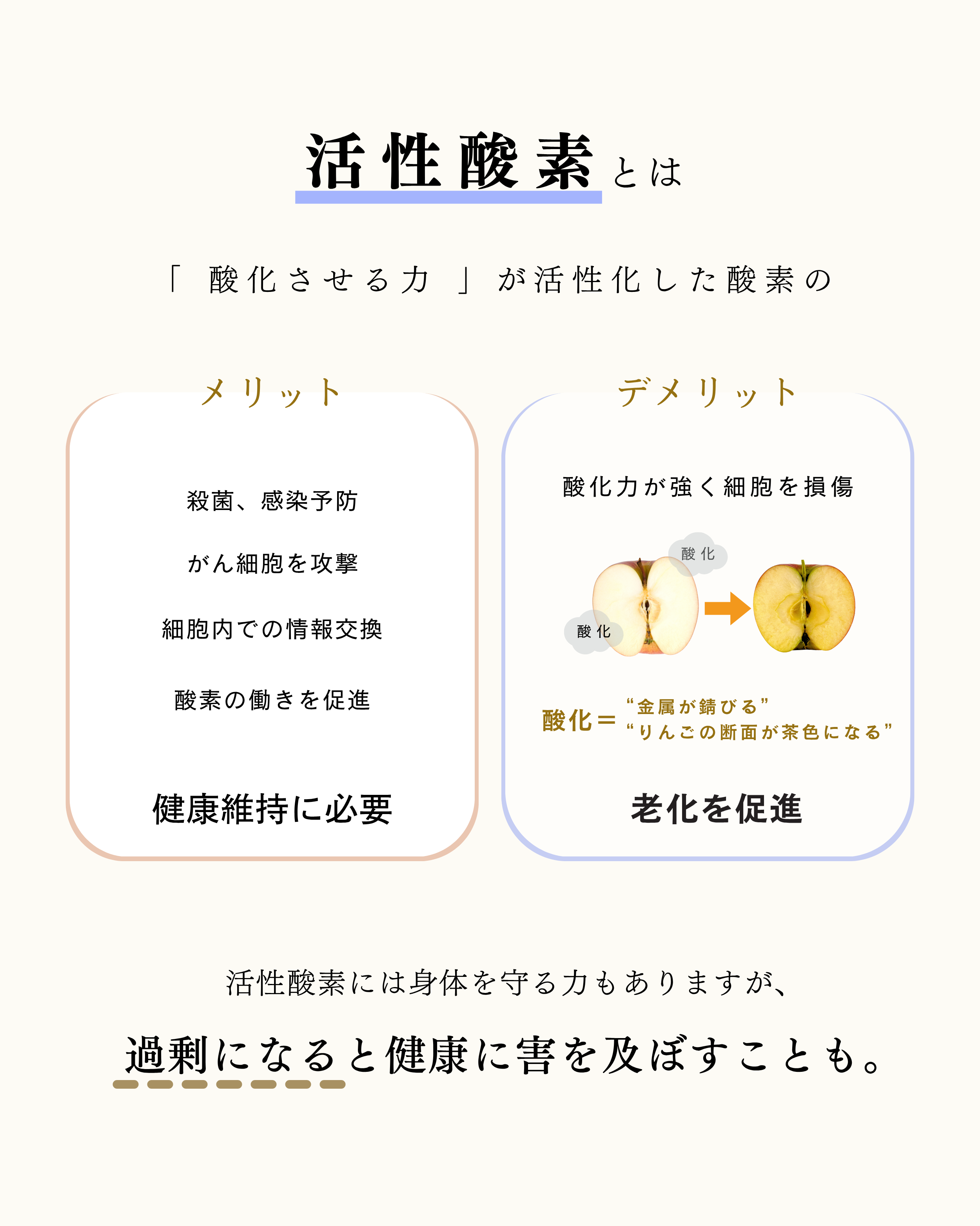 健康を維持する役割もあり、ヒトに欠かせない活性酸素ですが、酸化力が強く、過剰になると細胞を損傷し、体を「酸化」させていきます。