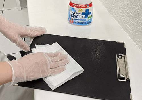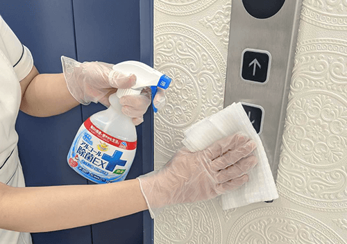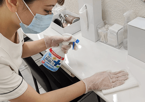 受付、待合い、メイクルーム、ドアノブ、ドライヤー、施術で使用する美容機器等、お客様やサロンスタッフが触れる場所・物品については、お客様ごとにこまめに消毒を実施しております。