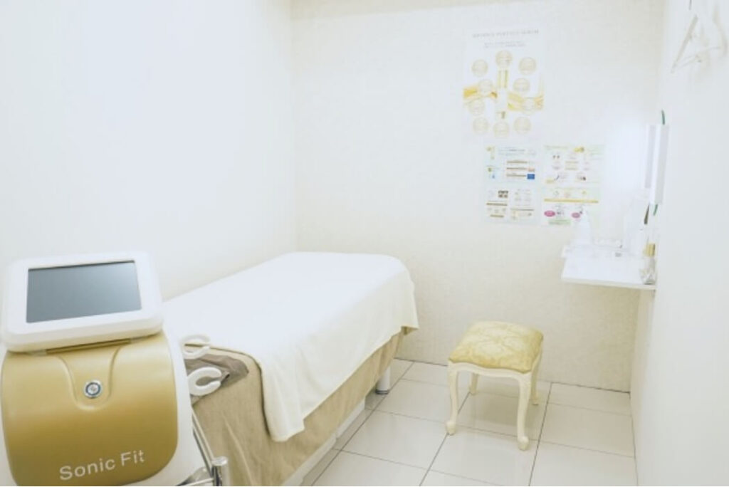 圧倒的に広いのが特徴です!全面ガラス窓なので、自然光がたっぷり入り、開放感のある明るい空間になっています。内装は白を基調とした洗練されたデザインで、エステサロンというよりクリニックのような専門的な雰囲気です。広々としたサロンでリラックスしたいお客様には、ぴったりの環境です!